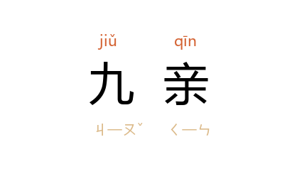 ⒈ 由本身上推至父母、袓父母、曾袓父母、高袓父母四辈,下推至子、孙、曾孙、玄孙四辈,称为「九亲」。