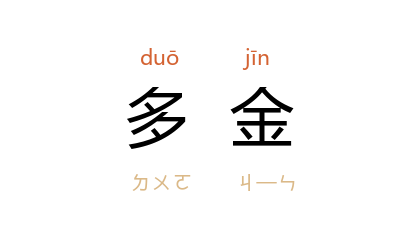 引《战国策·秦策一》:“苏秦 曰:‘嫂何前倨而后卑也?’嫂曰:‘以 季子 之位尊而多金。’”元 郭钰 《秋望》诗:“燕 马关山远, 吴 船岁月深。归来 苏季子,何用苦多金?”明 沉德符 《野获编·礼部一·褐盖》:“其人拥多金,负小慧,学诗画,以此得交士大夫。”清 纪昀 《阅微草堂笔记·姑妄听之四》:“法师受妒妇多金,锻鍊周内,以酷济贪耳,吾岂服耶?”