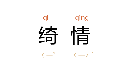 ⒈ 美妙的情思。南朝梁·沈约〈绣像赞〉:「绚发绮情,幽摛宝术。」清·王鹏运〈沁园春·词告主人〉词:「空中语,问绮情忏否?几度然疑。」也作「绮思」。