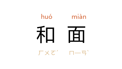 引北魏 贾思勰 《齐民要术·饼法》:“酒鱼眼沸,绞去滓,以和麵,麵起可作。”唐 费冠卿 《答萧建》诗:“搜泥如和麵,拾橡半添穜。”刘真 《春大姐》三:“她看了看正拿着面盆要去和面的 秀芳。”