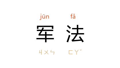 引《周礼·夏官·诸子》:“若有兵甲之事,则授之车甲,合其卒伍,置其有司,以军灋治之。”晋 葛洪 《抱朴子·自叙》:“古人有急疾之义,又畏军法,不敢任志。”洪深 《赵阎王》第一幕:“今天我没有工夫,明天拿军法来慢慢地问你,枪毙你,还不省事!”