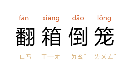 引《初刻拍案惊奇·卷一三》:「赵老六只得进去,翻箱倒笼。」《红楼梦·第九四回》:「大家偷偷儿的各处搜寻,闹了大半天毫无影响,甚至翻箱倒笼,实在没处去找。」