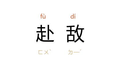 引《隋书·于仲文传》:“今者,人各其心,何以赴敌?”明 刘基 《楚人伐郑》:“虽起救 郑 之师,而逡巡畏缩,不即赴敌,遂使 郑国 失三大夫。”《冷眼观》第二七回:“有时他偶感风寒,不能亲身赴敌,别人借了他的这面关王旗出去,也是一律包打胜仗。”