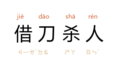 英murder with a borrowed knife——make use of another person to get rid of an adversary; murder by means of another's aword; murder with a borrowed knife;