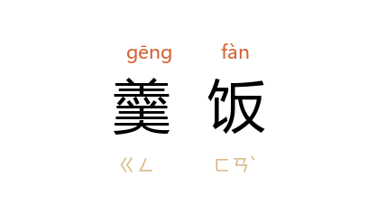⒈ 奠祭祖先的饭菜。吴地习俗,在未除孝以前,每日三餐仍与死者生前相同,在灵前设祭,俗称为「摆羹饭」。