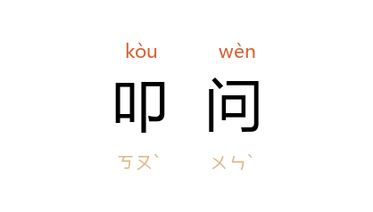 引《警世通言·金令史美婢酬秀童》:“金令史 只得又同阴捕转来,亲去叩问 秀童。”《说唐》第一回:“走到一条僻静小巷,已是黄昏时候,家家闭户,听得一家有小儿啼哭,遂连忙叩问。”郭沫若 《洪波曲》第十章四:“途中见一衣履整饬的老人,叩问之,颇能详道往事。”