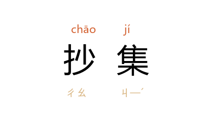 引《三国志·魏志·武帝纪》“能安之者,其在君乎” 裴松之 注引 晋 孙盛 《异同杂语》:“﹝ 太祖 ﹞博览羣书,特好兵法,抄集诸家兵法,名曰《接要》。”唐 李翱 《与淮南节度使书》:“近代已来,俗尚文字,为学者以抄集为科第之资。曷尝知不迁怒、不贰过为兴学之根乎!”