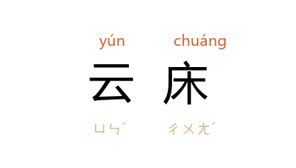 引唐 吴融 《月夕追事》诗:“曾听豪家碧玉歌,云牀冰簟落秋河。”宋 汪莘 《迁入新居后客至偶成》诗:“方壶 客去偃云牀,槐柳阴阴日自长。”《水浒传》第五三回:“当下 公孙胜 引着 戴宗、李逵 到 松鹤轩 内,正值真人朝真才罢,坐在云床上养性。”明 高启 《送基上人希载赴天界》诗:“龙河 旧日栖禪侣,想拂云牀正待师。”