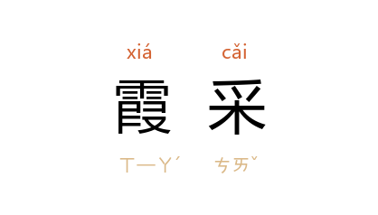 引隋 薛道衡 《重酬杨仆射山亭》诗:“朝朝散霞彩,暮暮澄秋色。”唐 张均 《岳阳晚景》诗:“水光浮日出,霞彩映 江 飞。”宋 王象祖 《寿台楼赋》:“即长虹之霞采兮,罩苍龙之云烟。”许杰 《惨雾》:“多理 红了的眼睛也退了一些热度,正如被太阳烧热了的霞彩,慢慢的被晚风扇凉一样。”