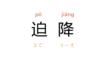 ⒈ 飞行中的飞机,因燃料不足、气流不稳定、机件故障或其他原因,难以续飞,须紧急著陆,称为「迫降」。