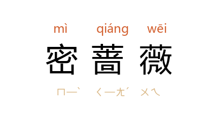 引清 梁绍壬 《两般秋雨盦随笔·密蔷薇》:“嫁女送亲,所在皆然, 广东 顺德县 为尤甚。凡来者环立门外,主不迎送,亦不供茶酒,名之曰‘密蔷薇’,其名色甚新。”