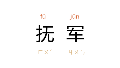 ⒉ 官名。将军称号。 三国 魏文帝 封 司马懿 为抚军将军。其后 晋、南北朝 皆有此称,省称抚军。