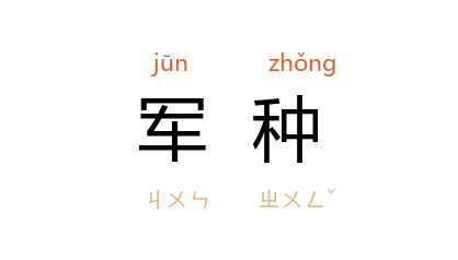 ⒈ 军队在其组成上,按照军队主要武器装备的不同性能和作战活动空间环境以及任务等的不同所作的基本区分。成分为陆军、空军、海军,有的还有防空军、战略火箭军。军种包括若干个兵种和专业兵种。