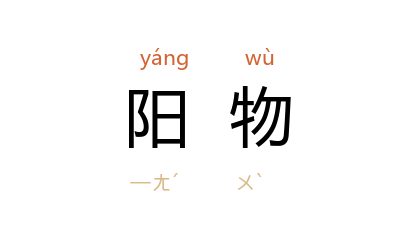 ⒈ 阳气旺盛之物。(1)指天。《易·系辞下》:“子曰:'乾坤,其易之门邪。'干,阳物也。坤,阴物也。阴阳合德,而刚柔有体,以体天地之撰。”高亨注:“干为天,天为阳物。坤为地,地为阴物。”(2)指太阳或雷电。《素问·方盛衰论》:“心气虚则梦救火阳物,得其时则梦燔灼。”