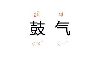 引宋 沉括 《泗州龟山水陆禅院佛顶舍利塔记》:“近岁过之,则舟人鼓气自若,无復向日危惧恂慄之色。”《朱子语类》卷一三三:“假使自欲如此做,也自鼓气不振。”曹丹辉 《伟大的历程》:“中央机关的许多干部和一些负责同志也在这里向战士们呼口号鼓气。”