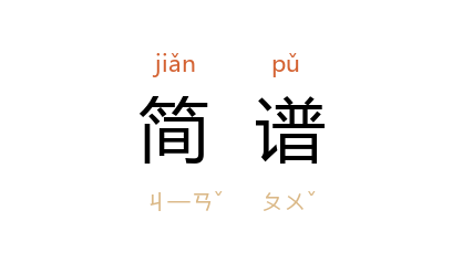 ⒈ 一种简易的音乐记谱法。约完成于十七、八世纪。现用的简谱以 1、2、3、4、5、6、7来表示 Do、Re、Mi、Fa、Sol、La、Si等七个音。在数字的上方标圆点表示高八度音,在下方标示则表示低八度音。