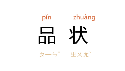 引《三国志·魏志·傅嘏传》:“案品状则实才未必当,任薄伐则德行未为敍。”《晋书·孙楚传》:“楚 与同郡 王济 友善。 济 为本州大中正,访问銓邑人品状,至 楚,济 曰:‘此人非卿所能目,吾自为之。’乃状 楚 曰:‘天才英博,亮拔不羣。’”