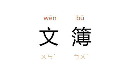 引《后汉书·循吏传·秦彭》:“每於农月,亲度顷亩,分别肥塉,差为三品,各立文簿,藏之乡县。”前蜀 杜光庭 《虬髯客传》:“家人自堂东舁出二十牀,各以锦绣帕覆之。既陈,尽去其帕,乃文簿钥匙耳。”《京本通俗小说·志诚张主管》:“当日晚算了帐目,把文簿呈 张员外。”《水浒传》第一一九回:“众多将佐功劳,俱各造册,上了文簿,进呈御前。”