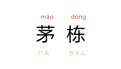引南朝 梁 沉约 《宿东园》诗:“茅栋啸愁鴟,平冈走寒兔。”唐 杜甫 《王十五司马弟出郭相访遗营草堂资》诗:“忧我营茅栋,携钱过野桥。”宋 孙觌 《春事》诗:“茆栋依林出,松扉傍水斜。”宋 刘克庄 《贺新郎·蒙恩主崇禧再用前韵》词:“服兰佩,结茅栋。”