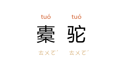 ⒈ 同“橐2驼”。同“橐2驼”。骆驼。《史记·匈奴列传》:“其畜之所多则马、牛、羊,其奇畜则橐驼、驴、骡、??。”