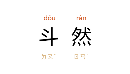 引清 褚人穫 《扫地诗》:“斗然狂飈起,埃圿散復攒。”清 袁枚 《新齐谐·误尝粪》:“忽一客 张 姓者斗然倒地,口吐白沫,噤不能声。”茅盾 《色盲》三:“他的猫脸上斗然透出一股‘大不以为然’的气味来。”