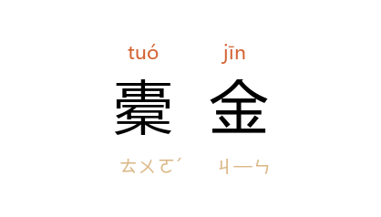 引宋 叶适 《詹鲁山解元以寿母求诗》:“九十人稀有,追懽尽橐金。”明 王世贞 《觚不觚录》:“而槖金如山,草芥人命者,拥冠盖扬扬閭里间矣。”清 戴名世 《唐允隆传》:“族人有相仇害, 允隆 出己橐金为排解,争遂以息。”