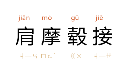 ⒈ 肩相摩,毂相接。本形容行人车辆拥挤,后亦借指人才辈出,络绎不绝。
