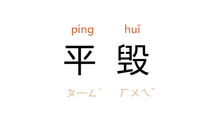引毛泽东 《游击区也能够进行生产》:“他们共有九种办法:第一,平毁封锁墙沟;第二,平毁可被敌人利用的汽车路,在其两旁种上庄稼。”闻捷 《海燕》:“我们的小伙子可乐了,喊着:‘谢谢敌人用炮弹给我们照明,谢谢敌人帮助我们平毁竹屿上的工事。’”