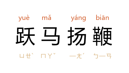 引元·王实甫《丽春堂·第一折》:「一个个跃马扬鞭,插箭弯弓。」明·高明《汲古阁本琵琶记·第一七出》:「亲承朝命赈饥荒,跃马扬鞭到此方。」