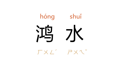 引《韩非子·饰邪》:“昔者 舜 使吏决鸿水,先令有功而 舜 杀之。”《三国志·吴志·吴主传》:“丹杨、句容 及 故鄣、寧国 诸山崩,鸿水溢。”唐 王勃 《常州刺史平原郡开国公行状》:“鸿水稽诛, 扶桑 落日之滨;妖朋蚁结, 孤竹 寻云之际。”