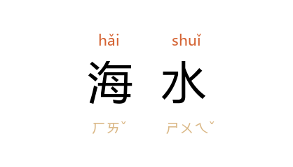 ⒈ 分布在海洋中的水。含有大量的盐分,以氯化钠为主,其次是氯化镁及少量的硫酸钙、碳酸钙等物质。