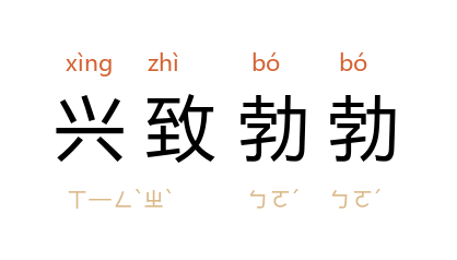 ⒈ 勃勃,旺盛的样子。兴致勃勃形容兴趣浓厚。也作「兴致勃发」。