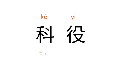 引《新唐书·狄仁杰传》:“官吏侵渔,州县科役,督趣鞭笞,情危事迫。”宋 司马光 《温公续诗话》:“﹝ 魏野 ﹞卒赠著作郎,仍詔子孙租税外,其餘科役皆无所预。”宋 王钦臣 《王氏谈录·唐三宗像》:“其画亦当时之跡,每持以见县官,免科役。”