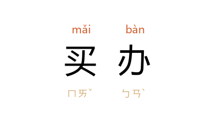 ⒋ 外商初入 中国 通商时,所雇用的采买人或管事人。后指外国资本家在旧 中国 设立的商行、公司、银行等所雇用的 中国 经理。