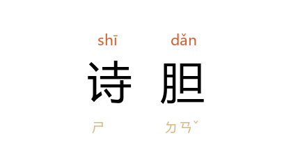 引唐 刘叉 《自问》诗:“酒肠宽似海,诗胆大於天。”清 厉鹗 《二月十六日吴尺凫招同袁舒雯沉栾城符幼鲁赵谷林意林杭大宗丁敬身包家山看桃花》诗:“岂如我辈诗胆顽,解使长云雨还阁。”姚锡钧 《题大觉乡居百绝》:“王郎 诗胆诚奇絶,苦茗回甘耐我思。”