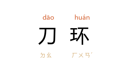 ⒉ 环、还同音,后因以“刀环”为“还归”的隐语。