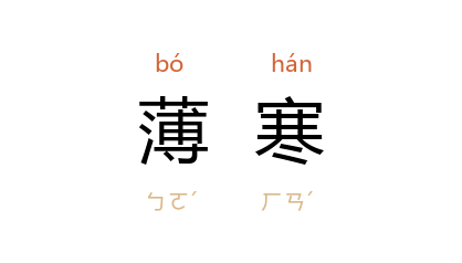 引《楚辞·九辩》:“憯悽增欷兮,薄寒之中人。”唐 杜甫 《重简王明府》诗:“甲子西南异,冬来只薄寒。”清 纳兰性德 《苏幕遮》词:“时节薄寒人病酒,剗地梨花,彻夜东风瘦。”叶圣陶 《秋》:“轻风送来清新的草气,也送来阵阵的薄寒。”