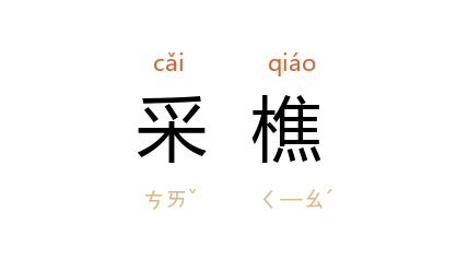 一本作“樵采”。打柴。 《左传·桓公十二年》:“请无扞采樵者以诱之。”