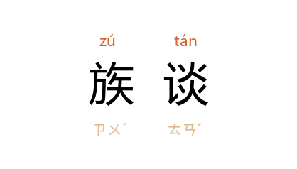 引《周礼·秋官·朝士》:“禁慢朝,错立族谈者。”郑玄 注:“错立族谈,违其位僔语也。”贾公彦 疏:“僔,亦聚也;聚语,解族谈也。”唐 杨炯 《盂兰盆赋》:“规矩中,威容翕,无族谈,无错立,若乃山中禪定,树下经行,菩萨之权现,如来之化生。”宋 司马光 《言王广渊札子》:“臣伏见新除 王广渊 直集贤院,外廷之人无不怪惑,偶语族谈,莫知其故。”