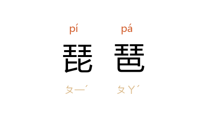 ⒈ 乐器名。秦代人民根据鼗的形式创出直柄、圆形音箱的弹拨乐器,至秦汉不断改进,定型为四弦十二品位,用手弹拨的乐器。西元四世纪,西域文化交流,致使半梨形音箱,四弦四柱的琵琶传入内地。唐、宋以来在这两种琵琶基础上不断改进,逐渐形成现今半梨形音箱,以桐木板蒙面,琴颈向后弯曲,琴杆与琴面上设四相九至十三品、四弦的琵琶。除用于歌唱、曲艺、戏曲和歌舞伴奏外,也用于乐器的合奏、伴奏和独奏。