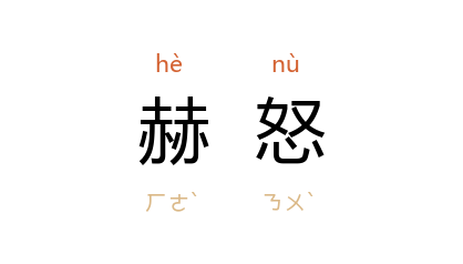 引语本《诗·大雅·皇矣》:“王赫斯怒。”汉 王粲 《从军》诗:“相公征 关 右,赫怒震天威。”《旧五代史·晋书·少帝纪五》:“自启衅端,果貽赫怒。”茅盾 《追求》五:“朱女士 张大了眼,忧虑着这位博士的赫怒,但心里未尝不乐意 章秋柳 的将要受窘。”