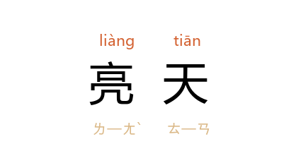引周立波 《暴风骤雨》第一部三:“紧接着工作队又开了一个小会,意见达到了一致:明儿一亮天,工作队全体动员去找穷而又苦的人们交朋友。”毕方 钟涛 《千重浪》第十六章五:“在 北大荒,夏天的黎明来得特别早,才两点多钟就已经亮天了。”