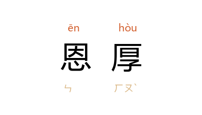引《汉书·路温舒传》:“方今天下赖陛下恩厚,亡金革之危,饥寒之患。”《后汉书·刘虞传》:“虞 以恩厚得众,怀被 北州。”《二十年目睹之怪现状》第一〇七回:“弓兵伺候了老爷十多年,老爷平日待我们十分恩厚,不过缺苦官穷,有心要调剂我们,也力不从心罢了。”