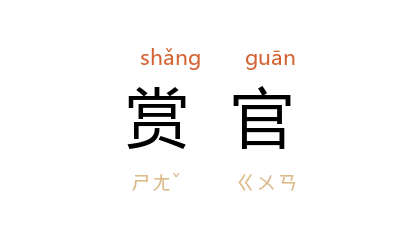 引《史记·平準书》:“有司言:‘天子曰:“……日者,大将军攻 匈奴,斩首虏万九千级,留蹛无所食。议令民得买爵及赎禁錮免减罪。”请置赏官,命曰武功爵。’”《汉书·循吏传·黄霸》:“霸 少学律令,喜为吏, 武帝 末以待詔入钱赏官,补侍郎謁者,坐同产有罪劾免。”颜师古 注:“因入钱而见赏以官也。”
