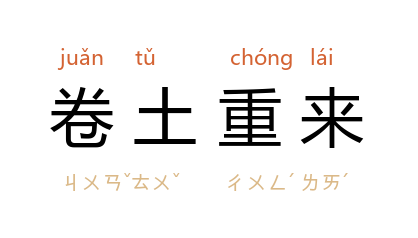 ⒈ 卷土,人马奔跑时扬起尘土;重来,重新猛扑过来。卷土重来比喻事情失败后,重组力量,再次来过。