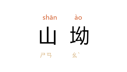 引《初刻拍案惊奇·卷三〇》:「随了他一路走去,到一个山坳之处,左右岩崖万仞。」