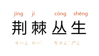 ⒈ 荆棘:荆条蒺藜;丛:聚集成堆。荆蔓蒺藜成群地生长出来。比喻前进道路阻碍很大,困难极多。