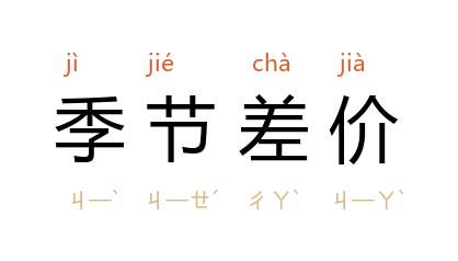 ⒈ 同一商品因在不同季节收购或销售而形成的价格差额。这是由于有的商品(如蔬菜)在不同季节生产有不同的成本,或者某一季节生产而常年消费(如水果)、常年生产而某一季节消费(如冷饮)所要支付的储存费用以及损耗引起的。保持合理的季节差价,可以保证市场均衡供应。