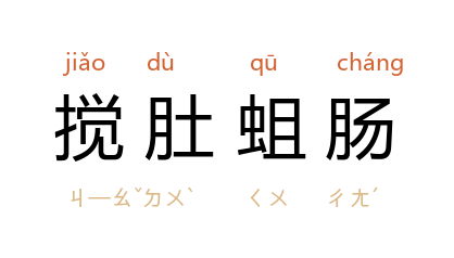 引元 石德玉 《曲江池》第四折:“原来是搅肚蛆肠的老虔婆,将瓦罐都打破。”元 李行道 《灰阑记》第一折:“普天下有的婆娘,谁不待要佔些独强,几曾见这狗行狼心,搅肚蛆肠。”