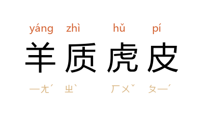 ⒈ 羊披上虎皮,本性仍是怯弱。比喻空有壮丽的外表,而缺乏实力。汉·扬雄元·汪元亨〈折桂令·厌红尘拂袖而归〉曲:「鄙高位羊质虎皮,见非辜兔死狐悲。」也作「虎皮羊质」。